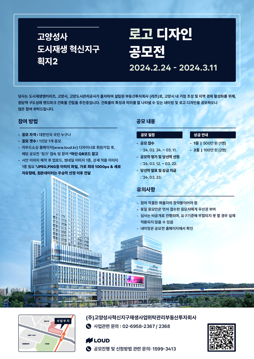 고양성사 도시재생 혁신지구 사업의 시행자인 ㈜서울투자운용에서 주관하는 고양성사 도시재생 혁신지구의 로고 디자인 공모전은 ‘라우드소싱’ 플랫폼을 통해 진행되고 특별한 자격 요건이 없이 누구나 신청이 가능하다. 1등 당선작에 500만원 등 총 상금 700만원이 지급될 예정이다.