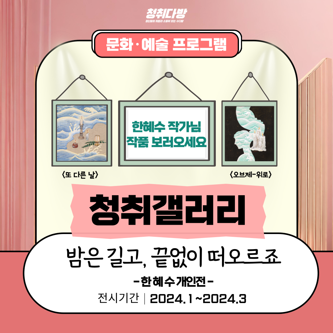 [부자동네타임즈 = 김인수 기자] 청년작가가 비상하는 ‘2024 청취갤러리’ 1분기 전시를 시작했다고 15일 밝혔다.