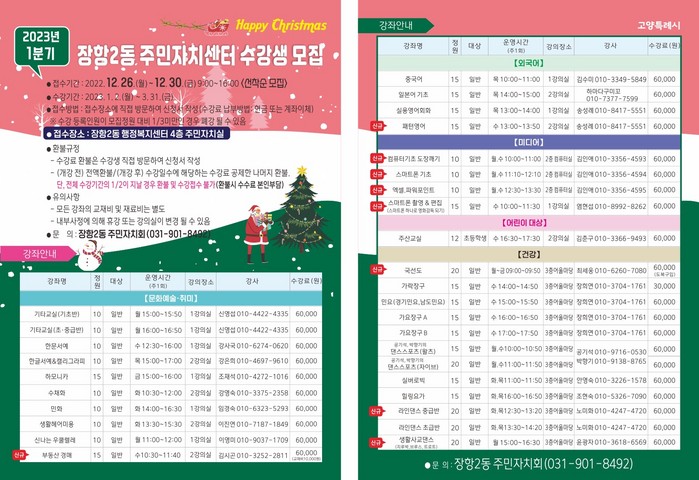 이상봉 장항2동 주민자치회 회장은 “다양한 문화강좌 프로그램을 통해 주민들의 지친 일상에 활력을 얻어가기를 바라며, 주민 여러분의 많은 관심과 참여를 부탁드린다”고 말했다.