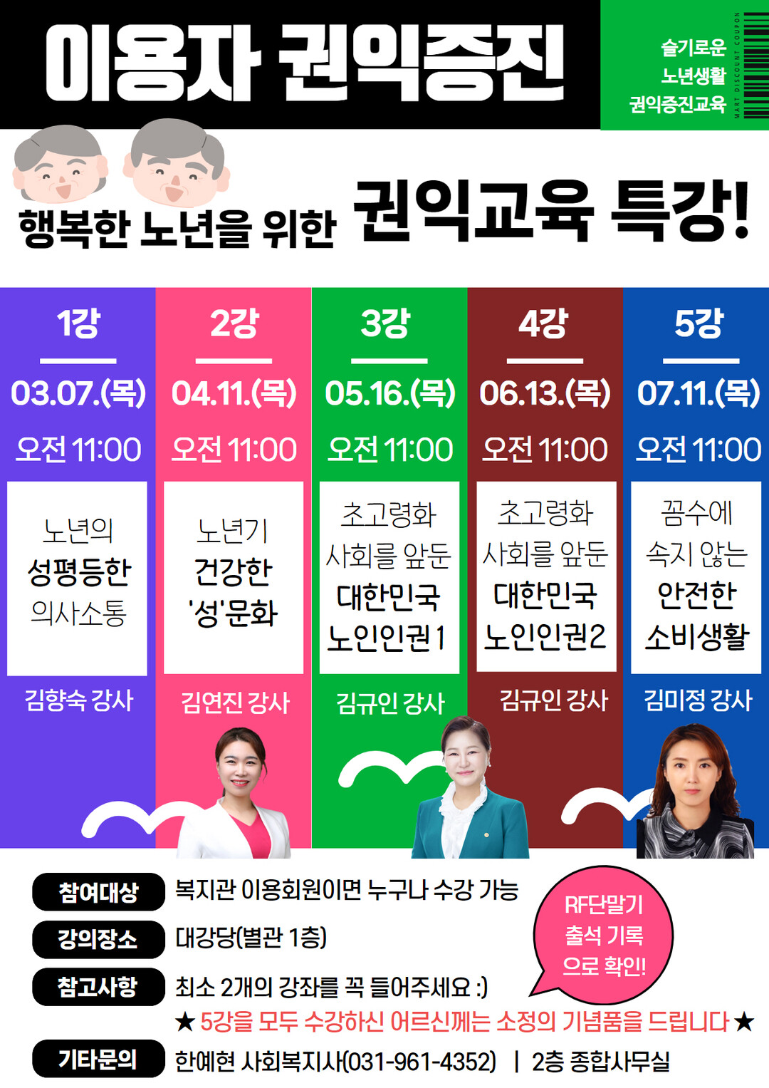총 5개의 주제로 구성된 이용자 권익증진 교육은 3월 7일(목)부터 7월 11일(목)까지 진행될 예정이다.