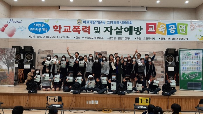 [부자동네타임즈 김인수기자] 지난 4월 26일 바르게살기운동 고양특례시협의회가 일산백신중학교 학생들을 대상으로 학교폭력 및 자살예방 뮤지컬 교육공연을 개최했다.