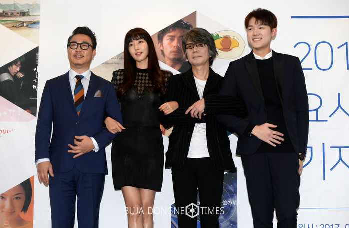 일본의 음악감독 및 작곡가 요시마타 료(오른쪽 두 번째)와 콘서트 게스트들이 24일 서울 강남구 논현동 임피리얼 팰리스 서울 호텔에서 열린 내한 공연 기자 간담회에서 포즈를 취하고 있다. 영화 '냉정과 열정 사이', 드라마 '하늘에서 내리는 1억 개의 별 등 OST와 국내 드라마 '일지매' 음악감독, '푸른 바다의 전설' BGM에 참여한 요시마타 료 감독의 첫 내한 콘서트는 오는 3월 5일 서울 세종문화회관 대극장에서 열린다. 왼쪽부터 기타리스트 배장흠, 배우 김사랑, 료 감독, 아이돌그룹 B.I.G 벤지. 2017.01.24.