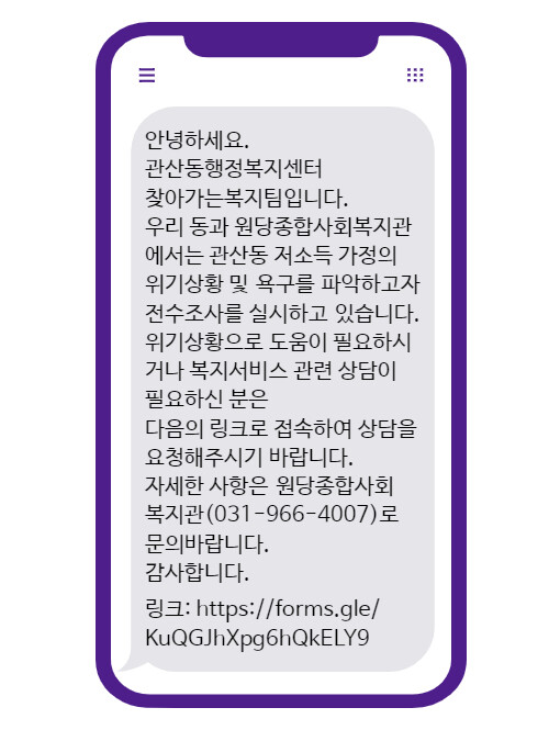 전수조사를 위해 관산동 찾아가는복지팀에서는 고양시원당종합사회복지관(관장 이은선)과 함께 안내 문자를 발송했다. 안내 문자에는 위기사항으로 도움이 필요하거나 복지 서비스 관련 상담이 필요한 경우 안내 링크를 통해 상담을 요청할 수 있다는 내용이 담겨있다.