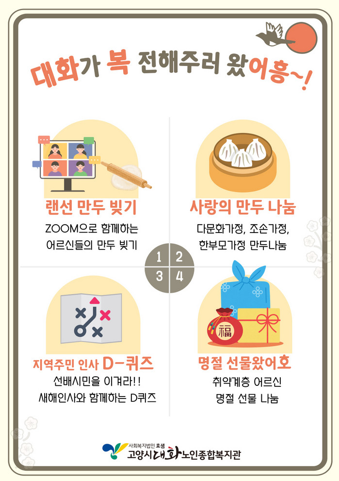 [부자동네타임즈 김인수기자] 고양시대화노인종합복지관(관장 최윤정)은 지역주민과 어르신들이 화합할 수 있는 온·오프라인 설날 행사 ‘대화가 복 전해주러 왔어흥~!’을 진행할 예정이다.