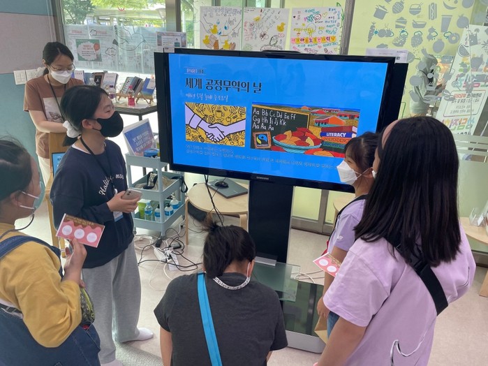 [사진설명] 2022년 ‘세계공정무역캠인의 날’, 청소년이 공정무역에 대해 설명하는 사진.