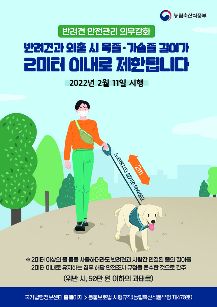 개정된 규칙 시행으로 목줄 길이 또는 가슴줄 길이가 2미터를 넘게 되어 위반할 경우 과태료 50만원이 부과된다. 전체 길이가 2미터가 넘는 리드줄을 사용하더라도, 줄을 손목에 감는 등 실제 반려견과 사람간 연결된 줄의 길이를 2미터 이내로 유지하는 경우 안전조치 규정을 준수한 것으로 본다.