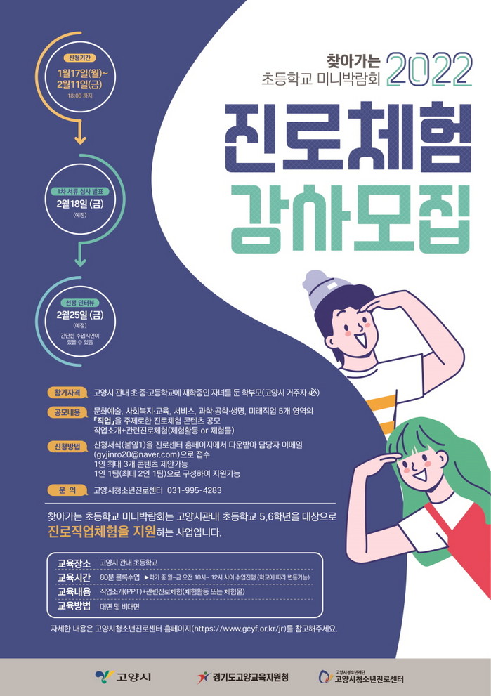 [부자동네타임즈 김인수기자] 고양시는 고양시청소년진로센터가 주관하는 ‘2022년 찾아가는 초등학교 미니박람회’ 지원을 위해 학부모 진로교육지도자(진로체험강사)를 모집한다고 21일 밝혔다.