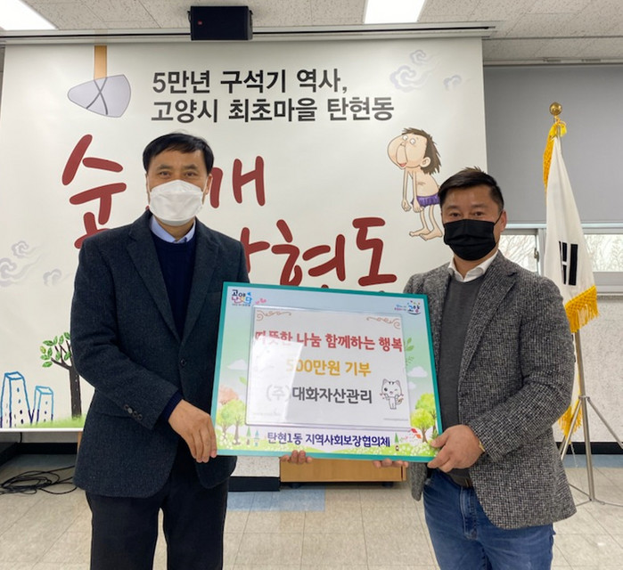 [부자동네타임즈 김인수기자] 고양시 일산서구 탄현1동 행정복지센터(동장 박상원)는 지난 14일 ㈜대화자산관리(대표 이상국)로부터 기탁받은 기부금 500만원에 대한 전달식을 가졌다.