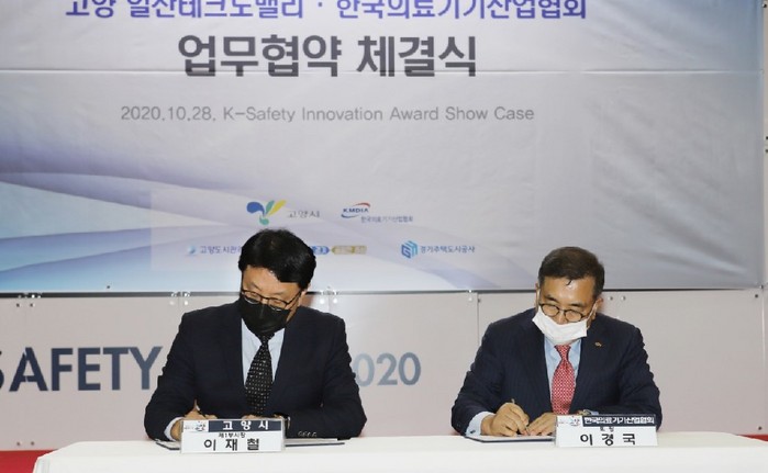 10월 28일부터 31일까지 열리는 ‘2020 K-방역 엑스포’의 개막일에 맞춰 진행된 이날 업무협약식에는 이재철 고양시 제1부시장과 이경국 한국의료기기산업협회 회장 등 10여 명이 자리했다.