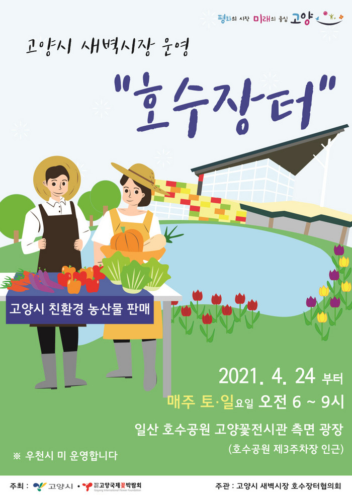 고양시 새벽시장 ‘호수장터’는 24일 개장을 시작으로 매주 토·일요일 진행되며 개장 이벤트로 24일과 25일 양일간 1만 원 이상 농산물을 구입한 선착순 300명에게 바질 화분을 증정할 예정이다. 카드·현금결제 모두 가능하며 고양페이도 사용할 수 있다. 당일 우천 시에는 장터가 취소된다.