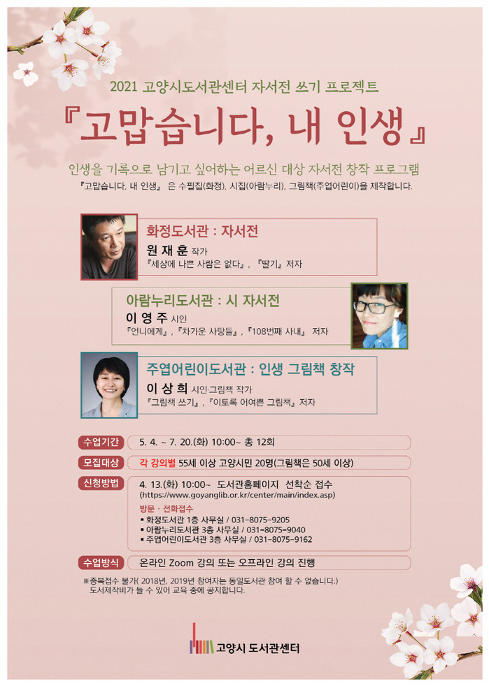 [부자동네타임즈 김인수기자] 고양시 도서관센터는 오는 5월 4일부터 7월 20일까지 자서전 쓰기 프로젝트‘2021 고맙습니다, 내 인생’을 운영, 오는 13일부터 신청을 받는다.