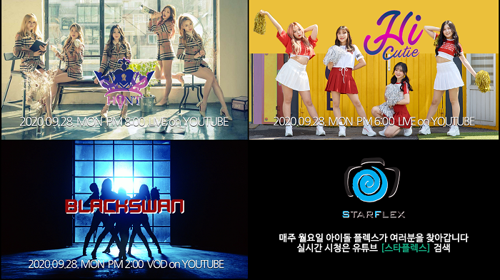 한편 랜선 공연장 '스타플랙스'는 9월 28일 6시 '하이큐티'와 8시 '힌트'의 무대를 마련하고 10월 데뷔하며 오픈 예정인 '블랙스완'의 vod를 제작한다.