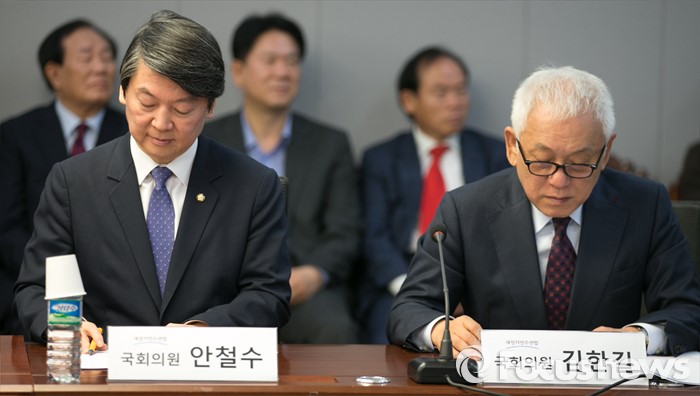 | △ 지난 10월 12일 오전 서울 여의도 국회에서 민집모와 콩나물 모임 주최로 열린 새정치민주연합, 뭐가 문제인가 토론회에 참석한 김한길(오른쪽), 안철수 전 공동대표가 자료집을 살펴보고 있다. <사진제공=포커스뉴스> |