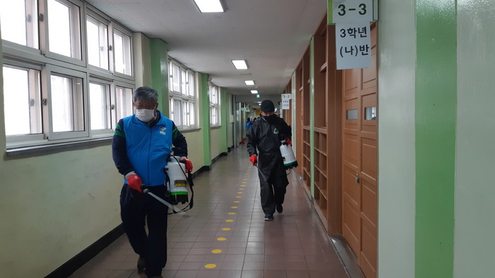 특히 연이은 개학 연기로 주중에는 긴급돌봄교실이 운영됨에 따라, 학생들과 교사들이 주로 활동하는 돌봄 공간과 교실, 화장실, 복도 등을 집중 소독했다.