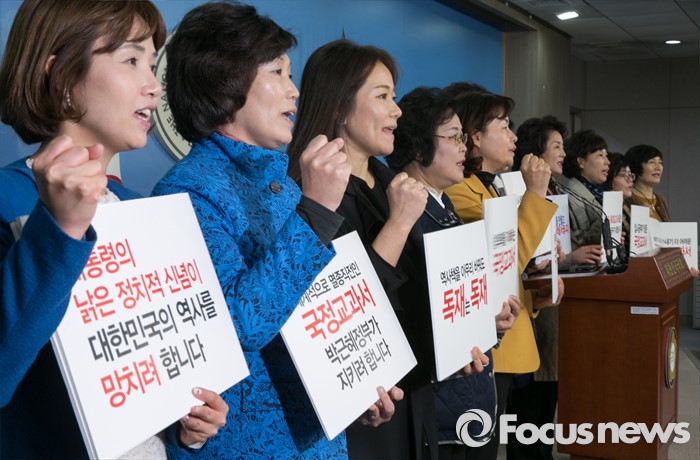 (서울=포커스뉴스) 서영교 새정치민주연합 전국여성위원장을 비롯한 당원들이 13일 오후 서울 여의도 국회 정론관에서 역사교과서 국정화 반대와 민생챙기기 촉구 기자회견을 하고 있다.