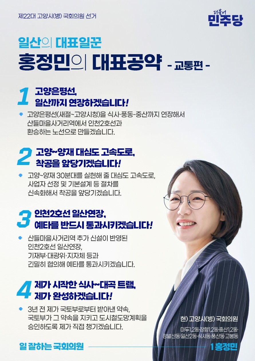 홍정민 의원은 일산 발전을 위한 3대 핵심 분야로 ①교통, ②주거, ③산업 등을 꼽고, 각 분야의 대표공약들을 순차적으로 공개했다.