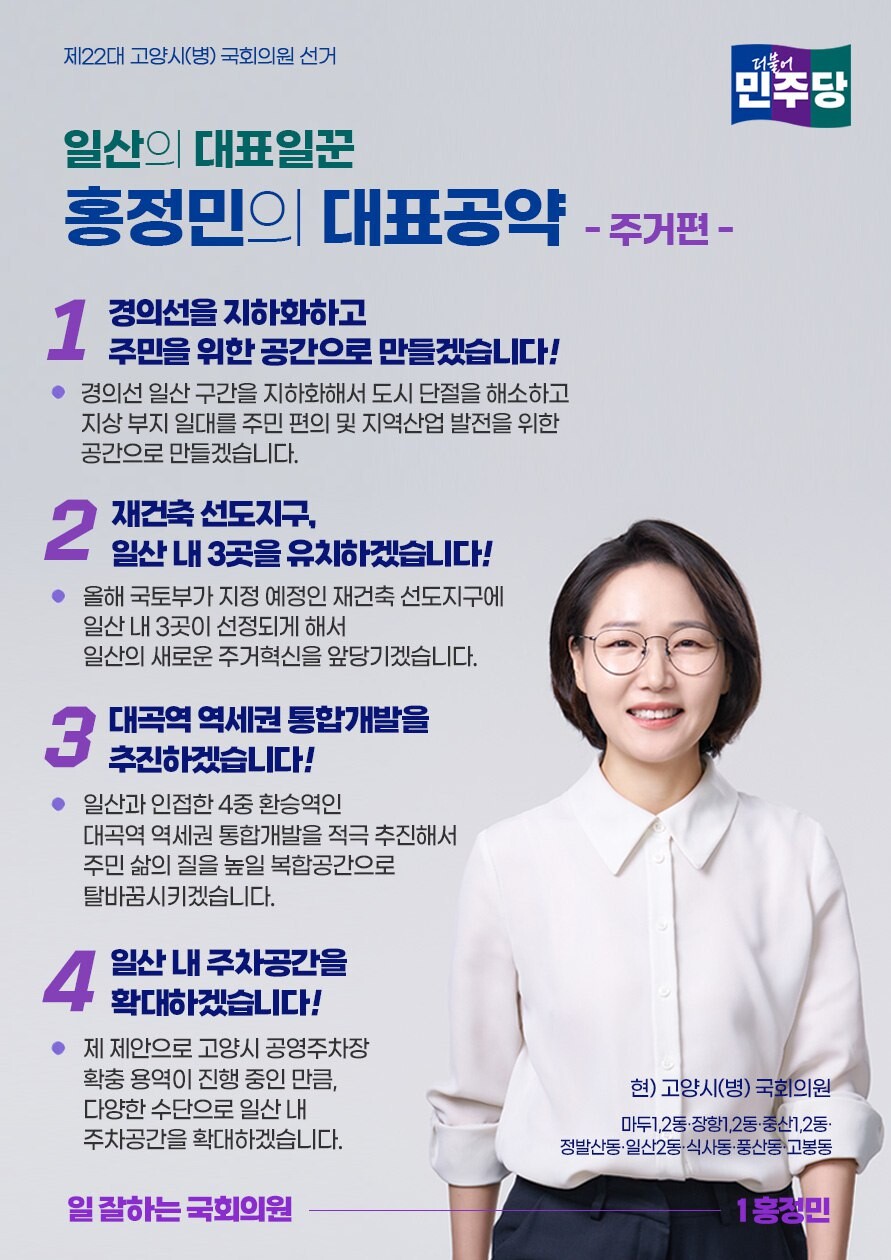 [부자동네타임즈 = 김인수 기자] 4.10 총선에서 재선에 도전하는 홍정민 국회의원(더불어민주당, 경기 고양병)이 일산 발전을 위한 3대 핵심 분야 12개 대표공약을 우선 발표했다.