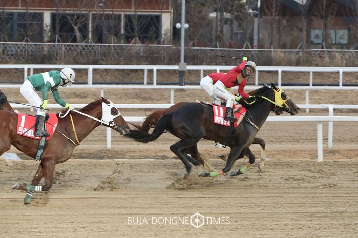하지만 진짜 승부는 4코너부터였다. 직선주로에 접어들자 순위가 크게 흔들리더니 ‘파워블레이드’와 ‘동방대로(5세, 수, 미국, R106)’가 빠른 스피드로 추입을 시작했다. 두 마리가 함께 역전에 성공하며 거의 동시에 결승선을 통과했다. 머리차(약 52cm)의 명승부 끝에 ‘파워블레이드’가 승리를 거머쥐었다. ‘트리플나인’이 3위, 막판 체력의 한계를 이기지 못한 ‘청담도끼’는 아쉽게 4위에 머물렀다.