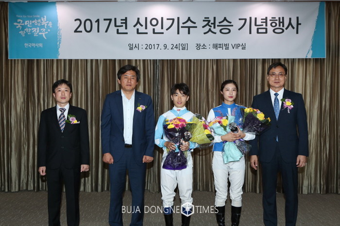 [부자동네타임즈 신동현 기자]24일(일) 한국마사회(회장 이양호)가 렛츠런파크 서울 신인기수들의 첫 승을 축하하는 기념행사를 했다. 지난 6월 2일 데뷔한 김효정, 이동진 기수는 첫 승 기념패와 꽃다발을 받으며 경마 기수로서의 성공적인 출발을 축하받았다. 함께 데뷔한 김덕현기수는 부상으로 참석하지 못했다.