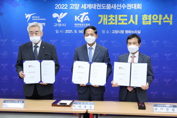 [부자동네타임즈 김인수기자] 9월14일 고양시청 평화누리실에서 열린 2022 고양 세계태권도품새선수권대회 개최도시 협약식에서 (왼쪽부터) 조정원 세계태권도연맹 총재, 이재준 고양시장, 양진방 대한태권도협회 회장이 협약서에 사인한 후 포즈를 취하고 있다. 고양 세계태권도품새선수권대회는 내년 4월 21일부터 24일까지 4일간 킨텍스 제2전시장 10홀에서 열린다. 70여개국 2,000여명 선수단이 36개 종목에서 걸쳐 경기를 펼칠 예정이다.