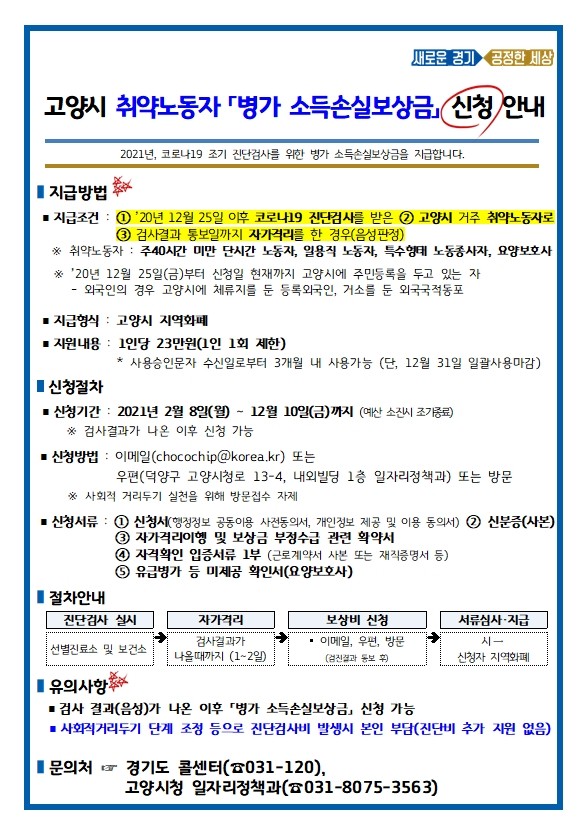 지원대상은 2020년 12월25일 이후 코로나19 진단검사를 받은 뒤, 검진결과 통보 시까지 자가격리를 이행하고, 음성 결과를 통보받은 고양시 거주 취약노동자다.