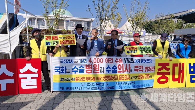 특히, 송 의장은 “Y병원 원장이 그동안 다수언론을 상대로 실시한 인터뷰도 모두 거짓이었나? 그런 의혹이 제기된다. 진실은 결코 침몰하지 않는다. 언젠간 수면 위로 떠올라 거짓과 불법행위를 일삼는 집단과 그 협조기구 및 장본인들이 위선적 가면 뒤에 감추고 있었던 흉한 몰골과 추악한 범죄를 폭로하게 되어있다. 국감에서 시민단체 요구가 수용되지 않는다면, 조만간 용산 대통령 집무실 앞에서 무릎관절 대리수술, 유령수술실태 전수조사 실시와 엄벌 및 근절 등을 촉구하겠다.”고 역설했다.