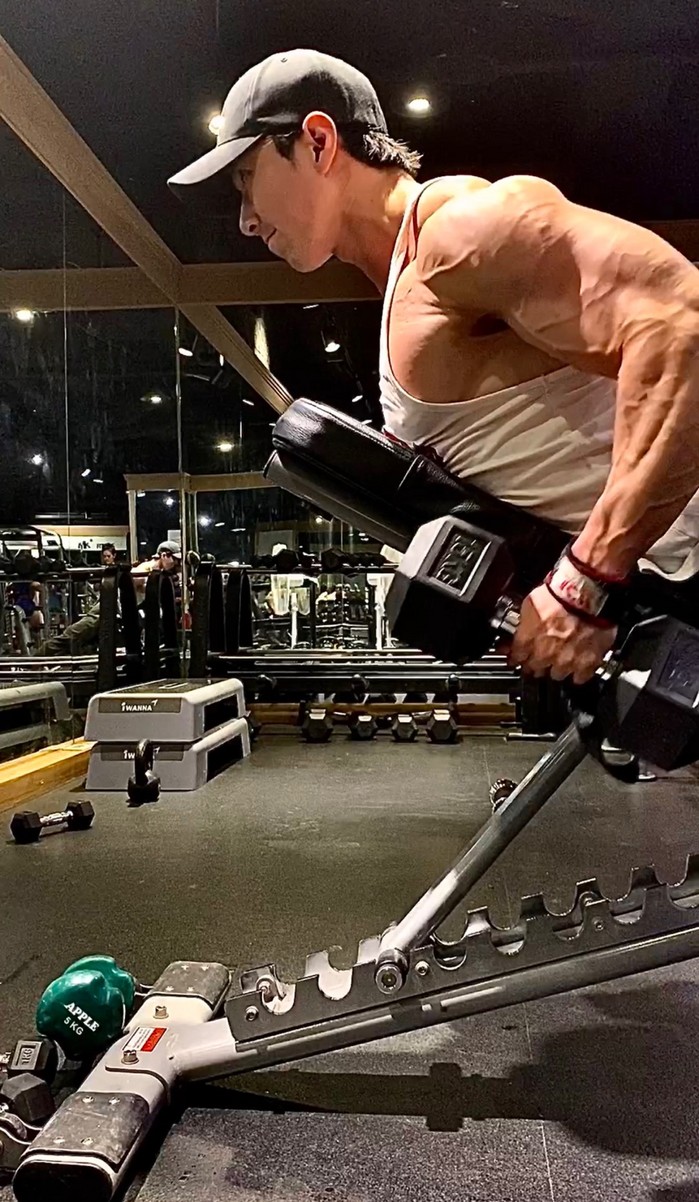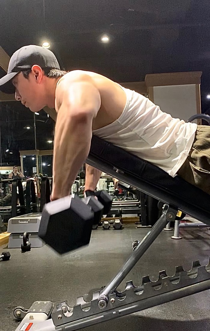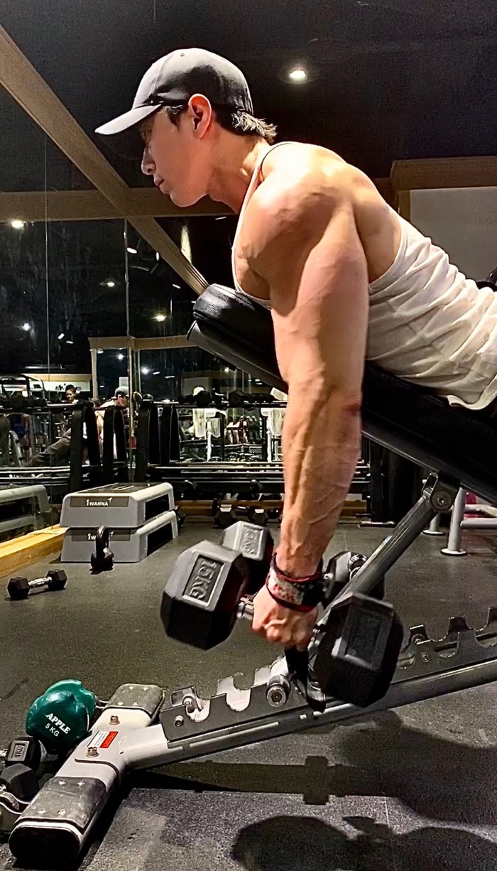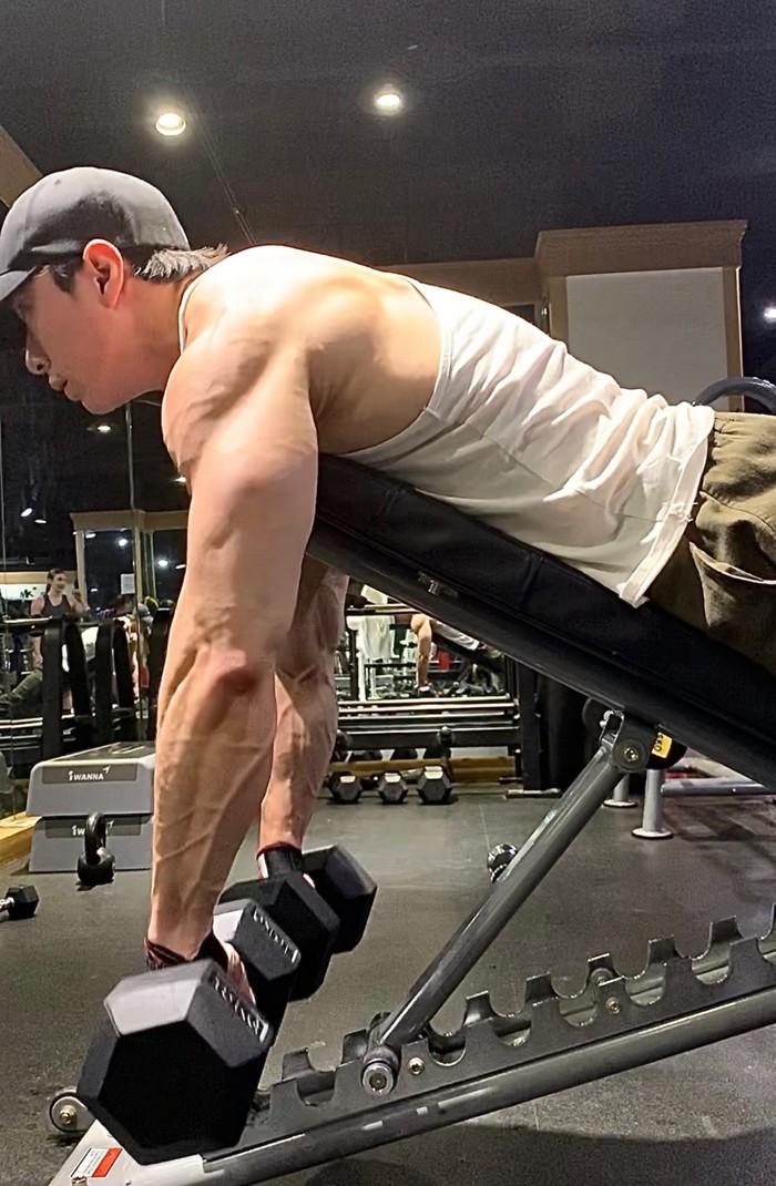 인크라인 벤트오버 레터널레이즈 + 인크라인 벤트오버 레터널레이즈 뉴트럴 그립 + 인크라인덤벨로우. 동작을 연속해서 쉬지 말고 진행해보자.