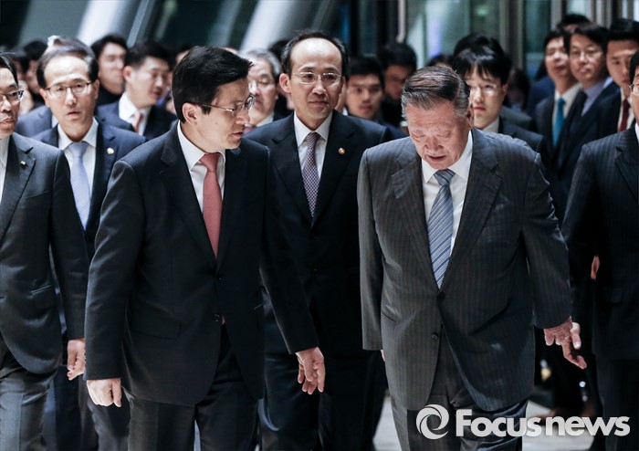 (서울=포커스뉴스) 황교안(왼쪽) 국무총리가 19일 오후 서울 영등포구 전국경제인연합회관에서 열린 '전경련 회장단 초청만찬'에 자리해 정몽구 현대자동차그룹 회장의 건강 상황을 묻고 있다.