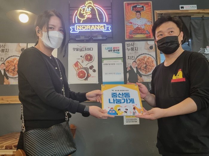 나눔가게 현판을 전달받은 노랑통닭 중산점 대표는 “어려운 이웃들에게 도움을 드릴 수 있어 보람차며 감사하다. 앞으로도 주위 소외계층 이웃들에게 나눔을 실천하여 많은 도움을 드리고 싶다”고 말했다.