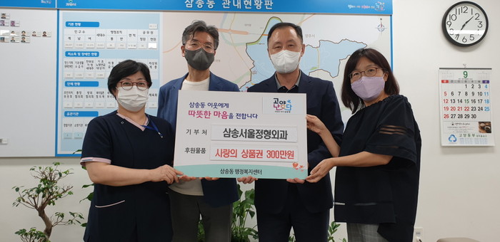 [부자동네타임즈 김인수기자] 고양시 삼송동행정복지센터(동장 김동원)는 "지난 9일, 삼송서울정형외과로부터 저소득층을 위한 300만원 상당의 5만원권 상품권 60매를 기부 받았다."고 밝혔다.
