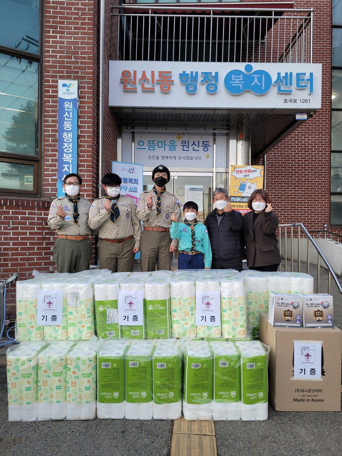 [부자동네타임즈 김인수기자] 고양시 덕양구 원신동행정복지센터(동장 신봉교)는 지난 17일, 한국스카우트연맹 행주산성스카우트(육성단체대표: 류철형 한국스카우트연맹 중앙훈련위원장) 대원들이 2년 동안 모은 돈으로 마스크 1,000매와 화장지 50세트를 준비해 어려운 이웃을 위해 써달라며 원신동행정복지센터에 전달했다고 밝혔다.