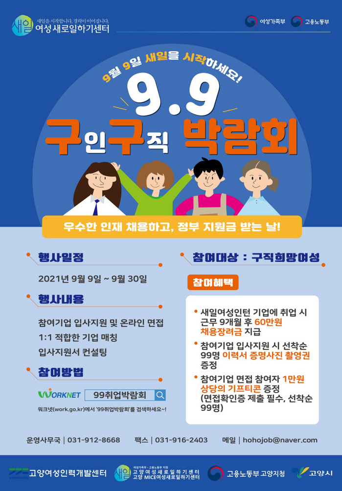 [부자동네타임즈 김인수기자] 고양시와 고양여성인력개발센터(관장 유혜림)가 9월 9일(목)부터 9월 30일(목)까지 청년층 여성구직자와 경력단절여성의 경제활동 지원을 위해 비대면 구인구직 박람회인 ‘구구여성취업박람회’를 개최한다.