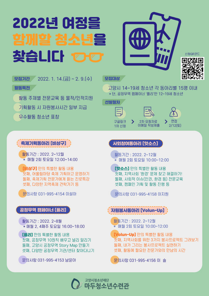 [부자동네타임즈 김인수기자] 고양시청소년재단 마두청소년수련관은 2022년에 함께 활동할 4개 동아리, 축제기획동아리 '비상구', 사회참여동아리 '핫소스', 공정무역캠페이너 '플리', 자원봉사동아리 'Volun-up'의 청소년을 모집한다.
