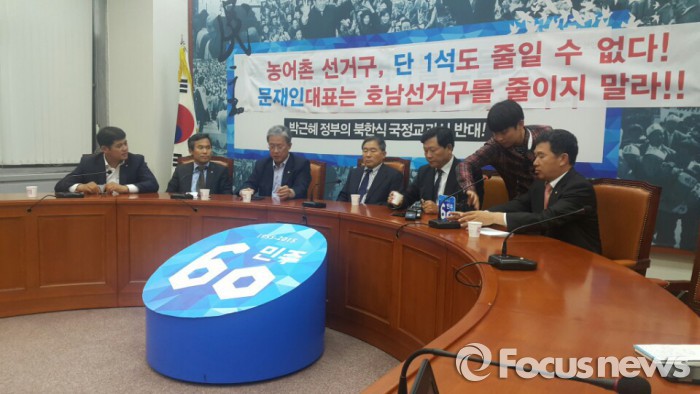 황주홍(전북 남원순창) , 강동원(전북 남원순창), 김승남(전남 고흥보성), 박민수(전북 진안무주장수임실), 유성엽(전북 정읍), 신정훈(전남 나주화순) 등은 '문재인 대표는 호남선거구를 줄이지 말라'고 적힌 현수막을 걸고 농성에 돌입했다.