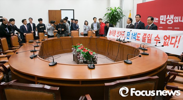 새누리당 대표최고위원실에서 11일 오후 4시쯤부터 농성을 시작한 권성동(강원 강릉), 염동렬(강원 태백영월평창정선), 한기호(강원 철원화천양구인제), 황영철(강원 홍천횡성) 의원 등은 '농어촌 선거구, 단 한석 줄일 수 없다'고 적힌 현수막을 내걸고 농어촌 선거구 사수를 외쳤다.