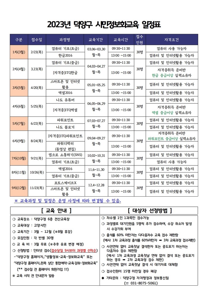 자세한 교육 일정 및 접수 일자는 덕양구청 홈페이지에서 확인할 수 있다. 기타 궁금한 사항은 덕양구청 자치행정과 정보통신팀(☎031-8075-5061)으로 문의하면 된다.