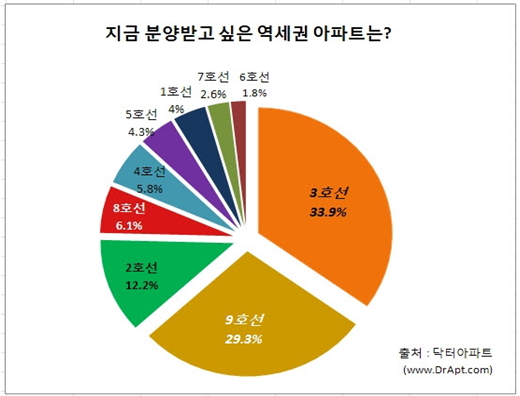 지금 분양받고 싶은 역세권 아파트로는 3호선(33.9%)이 1위를 기록했고 9호선이 29.3%, 2호선이 12.2% 등 순이었다.