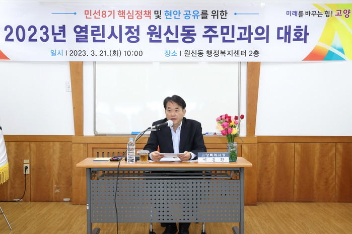이동환 시장은 21일 원신동 행정복지센터에서 ‘주민과의 대화’를 열고 “주교동 시청사 건립비용은 2,950억 원이지만, 원자재 값 상승 등을 반영하면 4,000억 원이 훨씬 초과될 수 있어, 재정자립도가 경기도 평균 절반 32.8%인 고양시에 지속적인 재정 부담으로 작용할 수 있다”고 밝혔다.