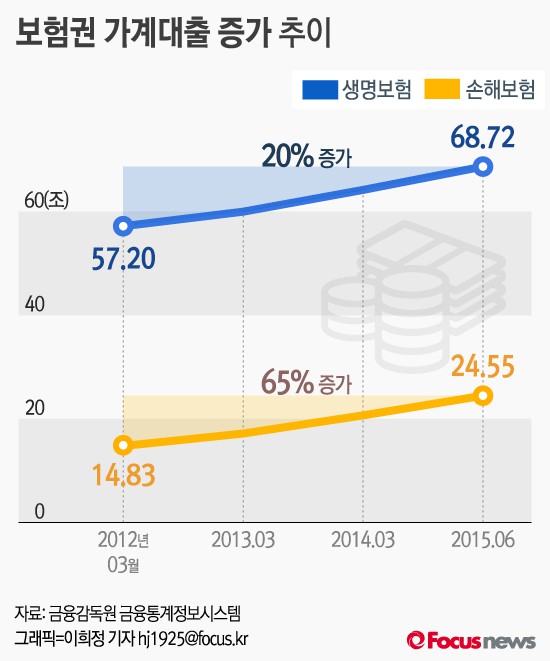 생보사의 가계대출채권 잔액은 2012년 3월말 57조1990억원에서 지속적으로 증가해 2013년 6월말 처음으로 60조원을 돌파했다. 한은이 기준금리를 내린 이후인 2014년 9월말의 잔액은 65조8255억원으로 집계됐으며 2015년 3월말(68조1289억) 6월말(68조 7230억)로 늘어났다. 2012년 3월말과 올해 6월말을 비교하면 생보사의 가계대출채권은 20%(11조5240억원)가량 늘어났다.