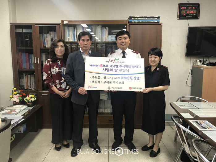 한편, 구세군 구미교회(담임사관 최관현)는 자선냄비모금으로 매년 추석명절 사랑의 쌀 나누기 외에도 중증장애인 가정지원, 새터민 가정지원, 저소득 청소년 장학금 지원, 경로당 지원 등 어려운 이웃들에게 따뜻한 사랑을 전하며 지속적으로 지역사회를 위한 나눔 활동을 펼치고 있다.