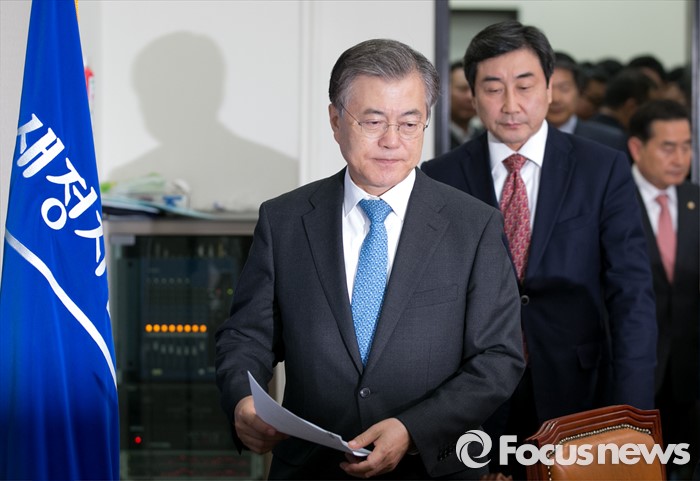 | △ 문재인(왼쪽) 새정치민주연합 대표와 이종걸 원내대표가 지난 9일 오전 서울 여의도 국회에서 열린 최고위원회의에 참석하고 있다. <사진제공=포커스뉴스> |