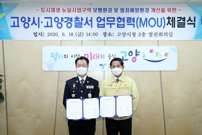 [부자동네타임즈 김인수기자] 고양시는 "9월 18일 시청 열린회의실에서 고양경찰서(서장 어윤빈)와 ‘도시재생 뉴딜사업구역 보행환경 및 범죄예방 환경 개선을 위한 업무협약’을 체결했다."고 밝혔다.