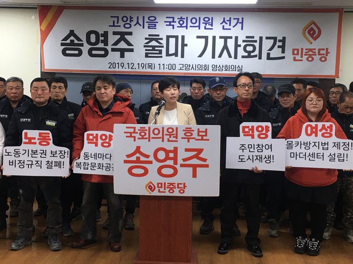 [부자동네타임즈 김인수기자] 민중당 송영주 전 경기도의원이 21대 국회의원 선거 고양시을 선거구에 출마를 공식 선언했다.