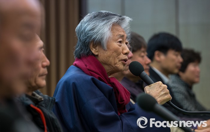 (서울=포커스뉴스) 백기완 통일문제연구소 소장이 4일 오전 서울 중구 프레스센터 기자회견장에서 열린 '12월 5일 범국민대회 국민참여 촉구 기자회견'에 자리해 발언을 하고 있다.