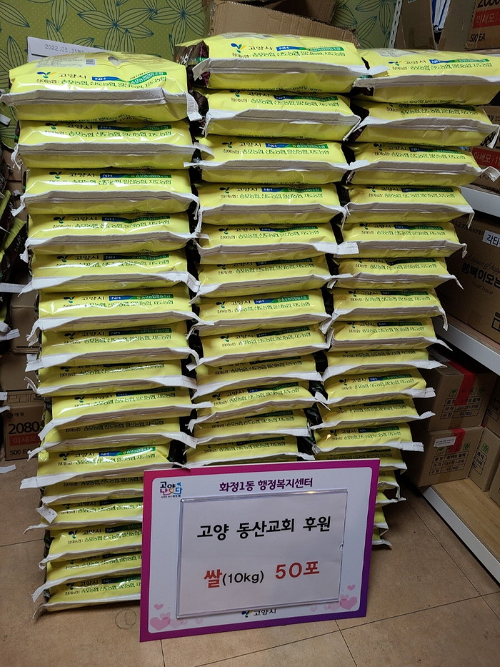 [부자동네타임즈 김인수기자] 고양시 덕양구 화정1동행정복지센터(동장 황선혜)는 지난 22일, 동산교회(목사 나동우)가 지역 내 소외계층을 위해 사랑의 쌀(10kg) 50포를 기부했다고 밝혔다.