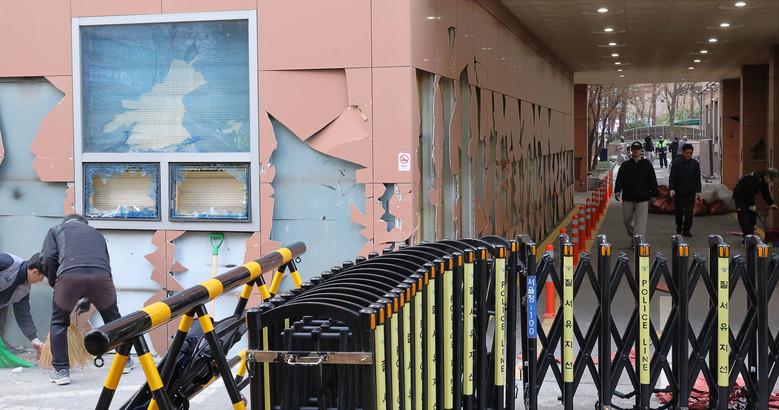 윤석열 대통령이 내란 우두머리 혐의로 구속되자 일부 윤 대통령 지지자들이 서울서부지방법원 내부로 난입해 불법폭력사태를 일으킨 19일 오후 서부지법에서 청사 관계자들이 파손된 시설물과 물품 등을 치운 뒤 복구작업을 하고 있다. 2025.1.19