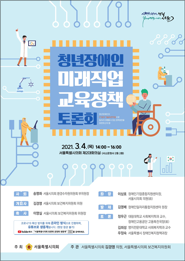 이 토론회는 2021년 3월 4일(목) 14시부터 16시까지 YouTube를 통해 생중계될 예정이며, 검색창에 “서울특별시의회 토론회·공청회, 제2대회의실”을 입력하면 접속할 수 있다.