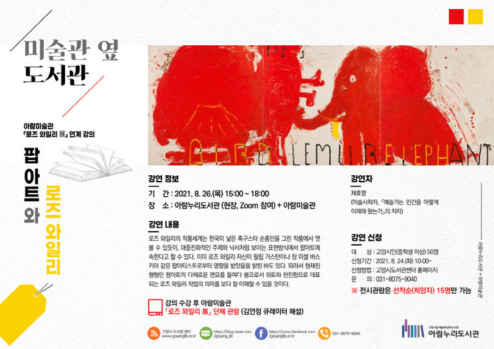 [부자동네타임즈 김인수기자] 고양시 아람누리도서관은 오는 8월 26일 목요일 오후 3시, 아람미술관 로즈 와일리 展 전시 연계프로그램을 운영한다.