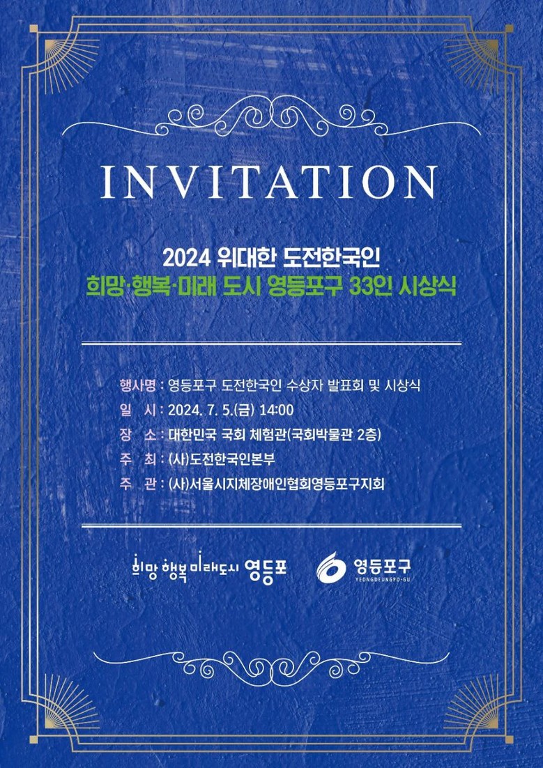 (사)도전한국인본부(상임대표 조영관)가 오는 7월 5일(금) 오후 2시 대한민국 국회 체험관(국회박물관 2층)에서 영등포구 도전한국인 수상자 발표회 및 시상식을 개최한다. 이번 행사는 '2024 위대한 도전한국인 희망 행복 미래 도시 영등포구'라는 주제로 개최하며 (사)서울시지체장애인협회 영등포구지회와 (사)대한노인회 영등포구지회가 공동 주관한다.