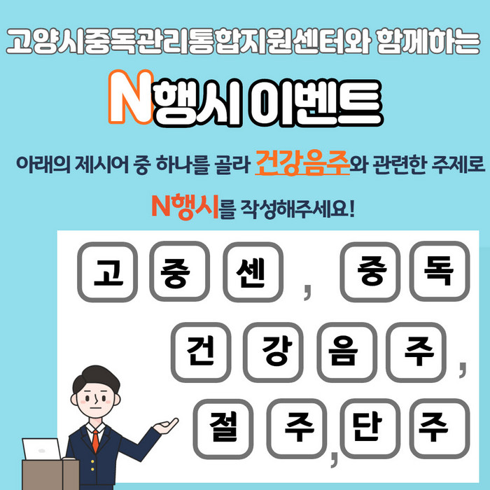 시민들의 많은 참여를 유도하고자 ‘N행시 짓기’ 이벤트를 결합한 이번 ‘건강음주 N행시 짓기’ 캠페인은, 고양시중독관리통합지원센터의 줄임말 ‘고중센’, ‘중독’, ‘건강음주’, ‘절주’, ‘단주’ 등 5단어를 이용해 시민들이 직접 N행시를 만들면서 자신의 음주 습관에 대해 점검하고 절주·단주를 실천하도록 돕는다.
